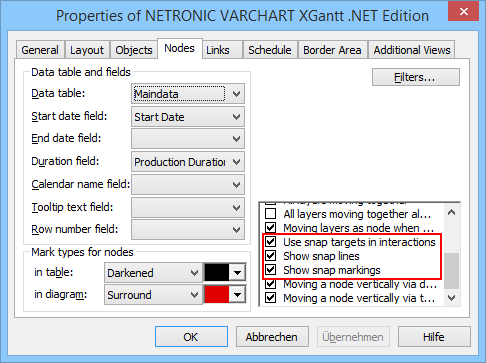 从VARCHART XGantt v5.0开始,用户可以为节点(或其图层)、日期线、线网格和日历网格定义所谓的“快照目标”。这意味着这些对象将自己定义的某些位置用作其他对象的“快照动作”的目标。当水平移动节点或修改节点、图层的大小时,此节点或图层的开始或结束日期将按时间顺序调整为快照工具为其他对象已定义的日期。开始或结束日期将在其旁边的5个像素内朝向快照目标移动,从而接管目标的确切日期。