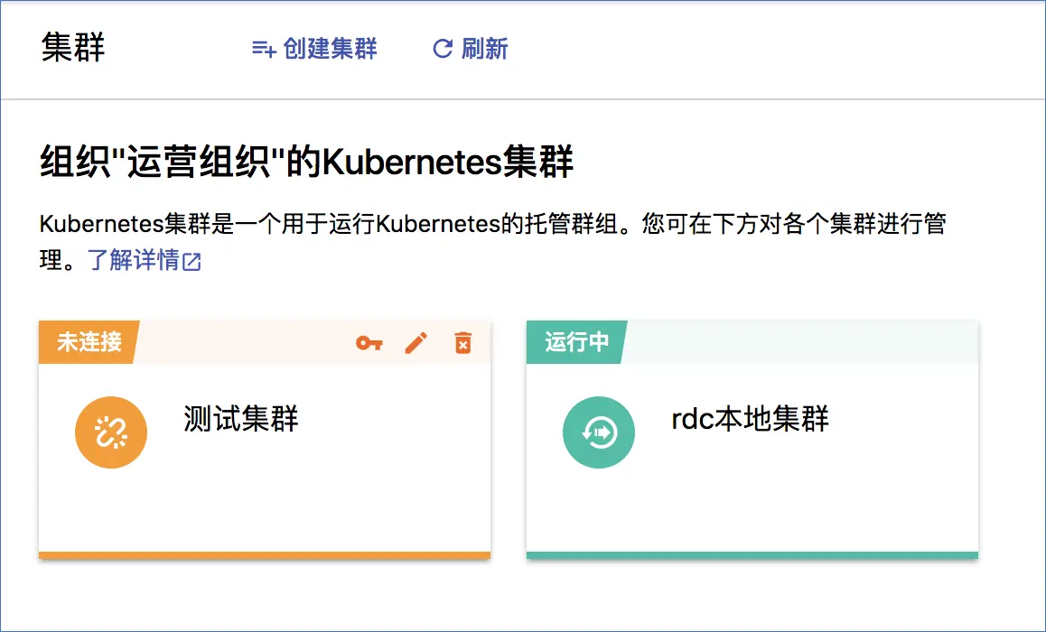 创建集群之后,平台会提供一份激活指令,将指令粘贴至Kubernetes集群中执行,成功后集群就连接成功了。在平台的界面上集群显示的状态也为运行中。下图所示脚本就是Agent的激活指令。