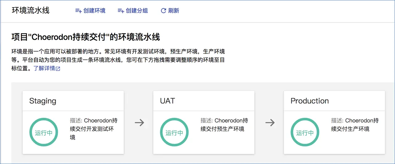Choerodon持续交付可以支持任意数量的集群加入平台,作为应用的部署环境,只要将平台中生成的Agent安装脚本在任意Kubernetes集群中执行,就可以将该集群加入平台,然后在平台上创建环境时可以选择该集群,可以一键创建环境。在同一个集群中可以创建多个环境,各个环境之间通过Kubernetes的命令空间隔离。