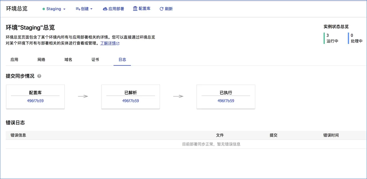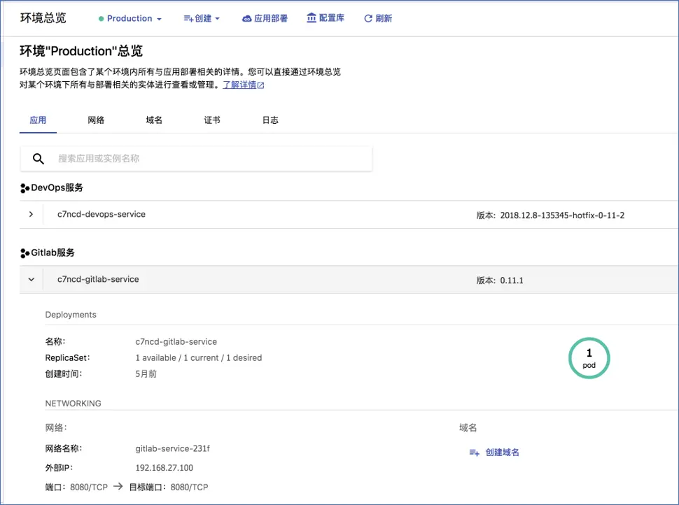 环境创建成功之后相关持续交付的部署操作即可选择该环境作为目标环境,进行应用部署,网络、域名、证书的创建。所有操作都将发送至Agent由Agent执行,所对应资源对象状态的变更也有Agent传输回来,进行实时展示。