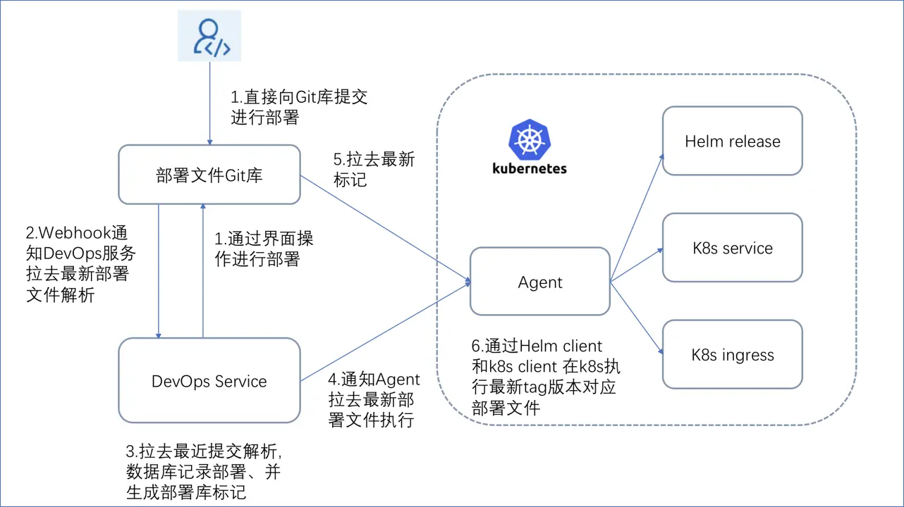 在GitOps中针对每个环境,在Agent初始化之后,将各个环境Git库SSH配置创建出来、并将Git库通过SSH拉至本机,检测是否有权限创建和删除tag,定时拉取最新的提交、同时在收到DevOps服务执行指令后,将最新的提交版本中的所有K8S资源文件执行至环境对应的命令空间之中。