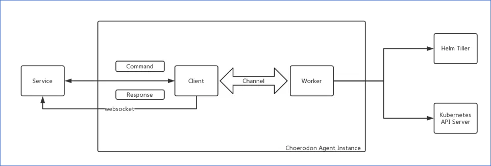 Choerodon Agent通过WebSocket Client与外部的猪齿鱼部署服务进行连接、执行命令等交互。内部通过Helm客户端与Kubernetes集群。