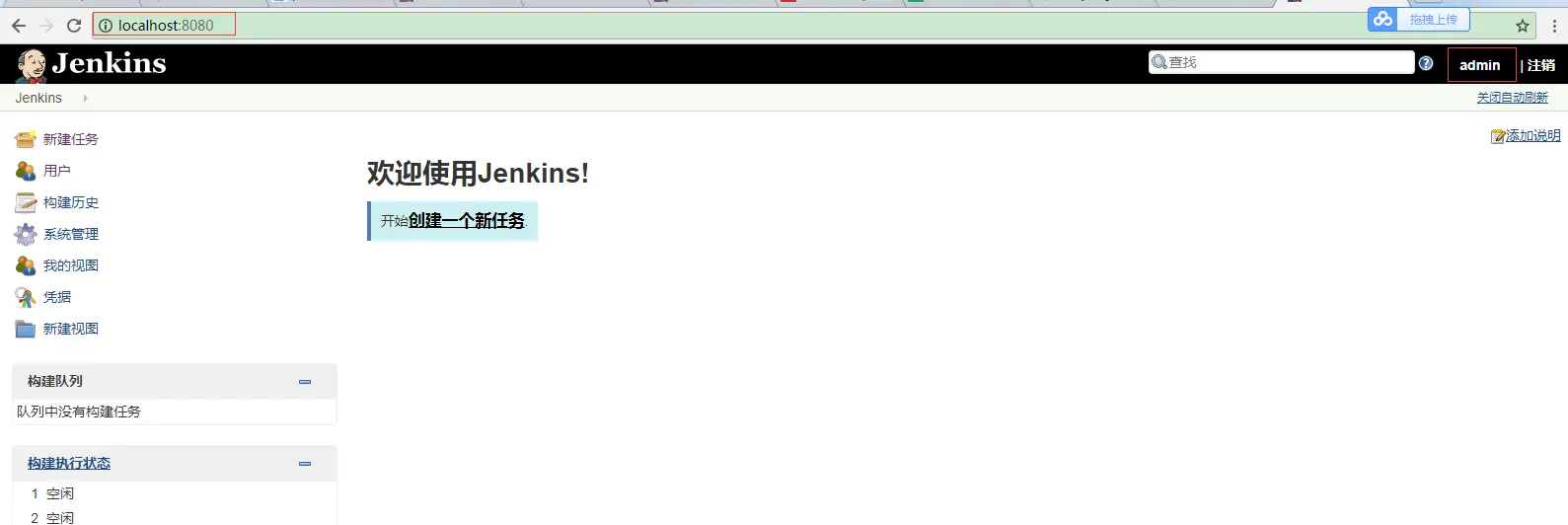 step 3. 点击解压后的 .msi 文件,一步一步安装,安装之后会自动跳转到 localhost:8080 页面并打开。此时 jenkins 服务已经打开(此处跳过了新建用户的设置)。如图: