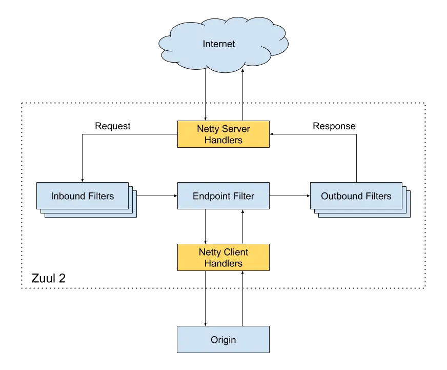 随着业务的不断发展,Zuul对于Netflix来说性能已经不太够用,于是Netflix又开发了Zuul2。Zuul2最大的变革是基于Netty实现了框架的异步化,从而提升其性能。根据官方的数据,Zuul2的性能比Zuul1约有20%的提升。Zuul2架构图如下: