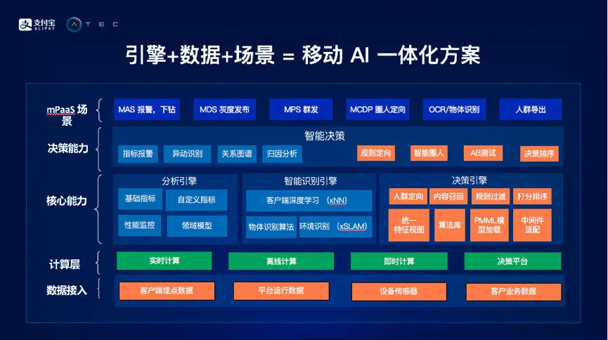 mPaaS 3.0全面向智能化进行升级,推出了智能投放,舆情分析,多媒体,预测4款智能化组件。同时智能预测圈人的功能,与之前发布的消息推送服务(MPS),发布服务(MDS)进行了全面整合,例如可以通过智能预测来判断接下来一周即将流失的客户,然后针对这部分用户发布一个消息 (通过MPS服务),或者通过智能投放服务发放一个营销活动(通过智能投放服务MCDP),促使这些用户能够继续留存下来。所以这次升级不仅仅是推出了智能化组件,更是整个平台的智能化升级。同时 mPaaS 3.0 解决了智能化能力落地难的问题, mPaaS 提供数据采集,智能引擎,智能化场景一体化解决方案,开箱即用,无需做任何系统对接,数据对接。同时,也提供了数据和系统的扩展能力,可以结合业务数据服务更多的场景。