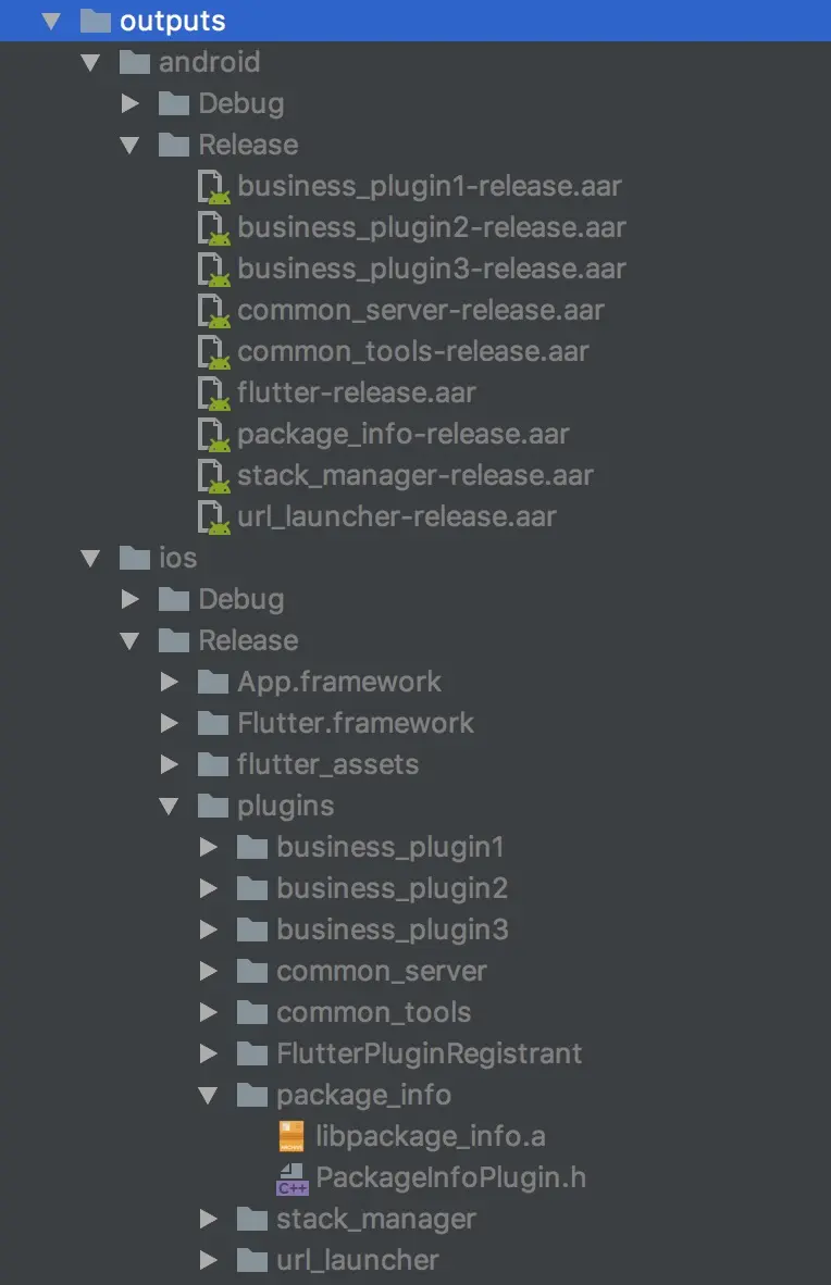 Android的打包比较简单,通过在Flutter Module中的.android子工程下执行./gradlew assembleRelease,则会在对应Flutter中Android子工程的build目录下输出对应aar产物,而重点是怎么获取依赖的各组件(Flutter Plugin)中的产物,则是通过.flutter-plugins文件,该文件是在packages get时自动生成的,里面包含了该Flutter工程通过Pub所依赖的库,我们可以解析这个文件,来获取对应依赖库的产物