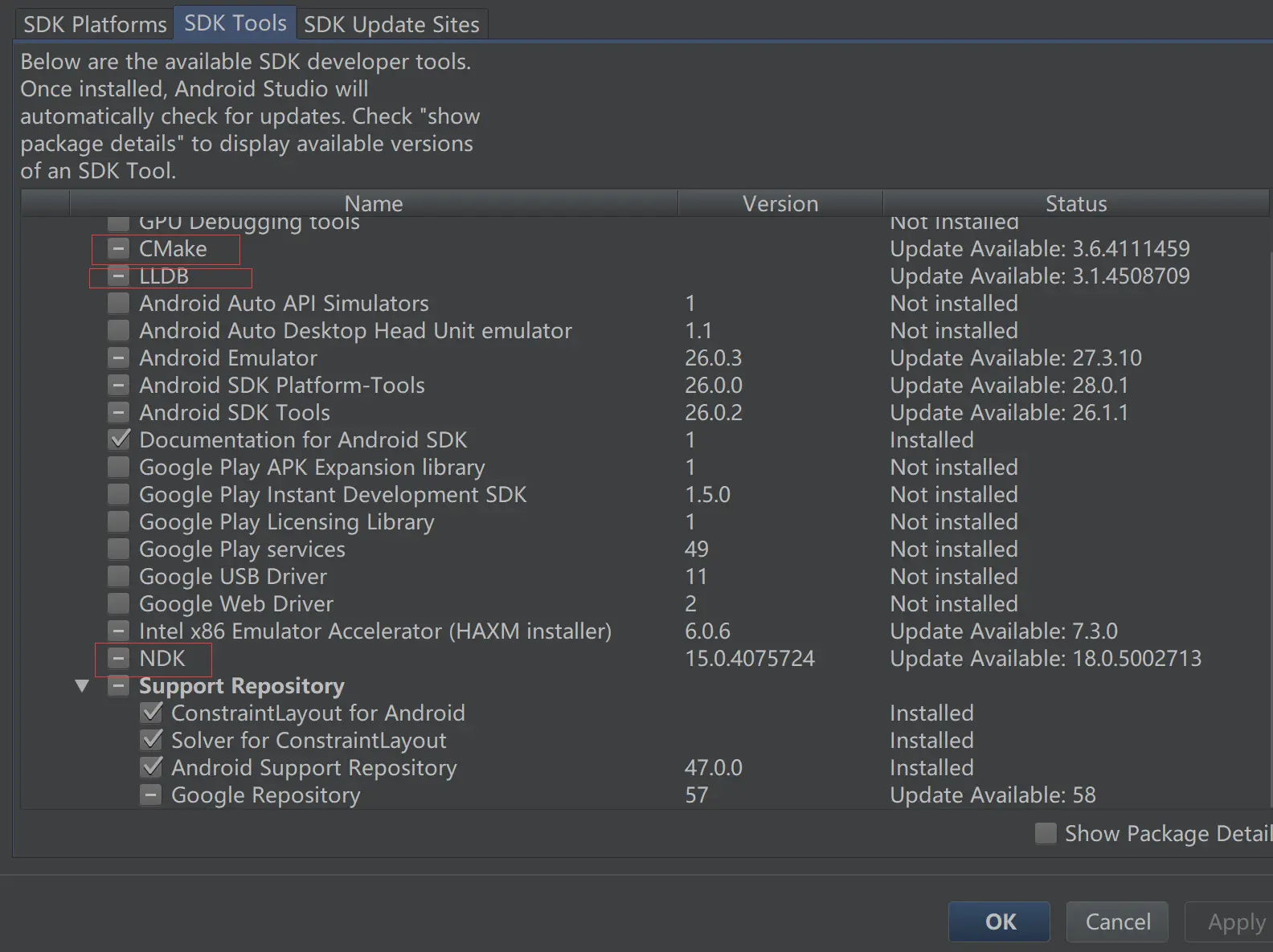 在 android studio 上进行 ndk 开发,相关的工具肯定少不了了,准备很方便,打开 SDK Tools ,勾选LLDB、CMake、NDK 进行安装即可。