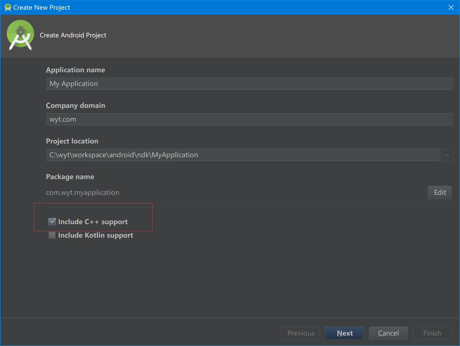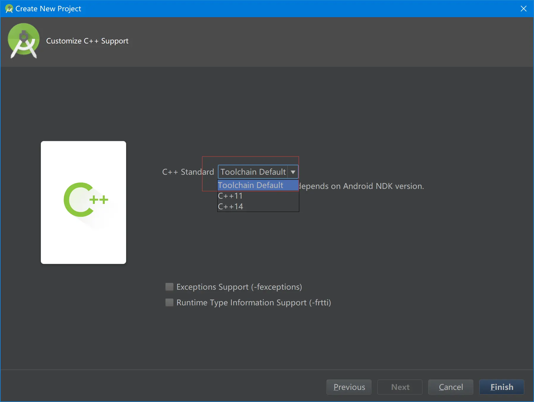 一路 next ,最后一步,设置 C++ 标准,这个东西我不太懂,反正使用默认的 Toolchain Default 时,工程使用的是 Cmake 对 native code 进行编译,网上好多ndk开发环境搭建的教程是根据 Android.mk、Application.mk写的,在Cmake下跑不起来(一把泪~~)