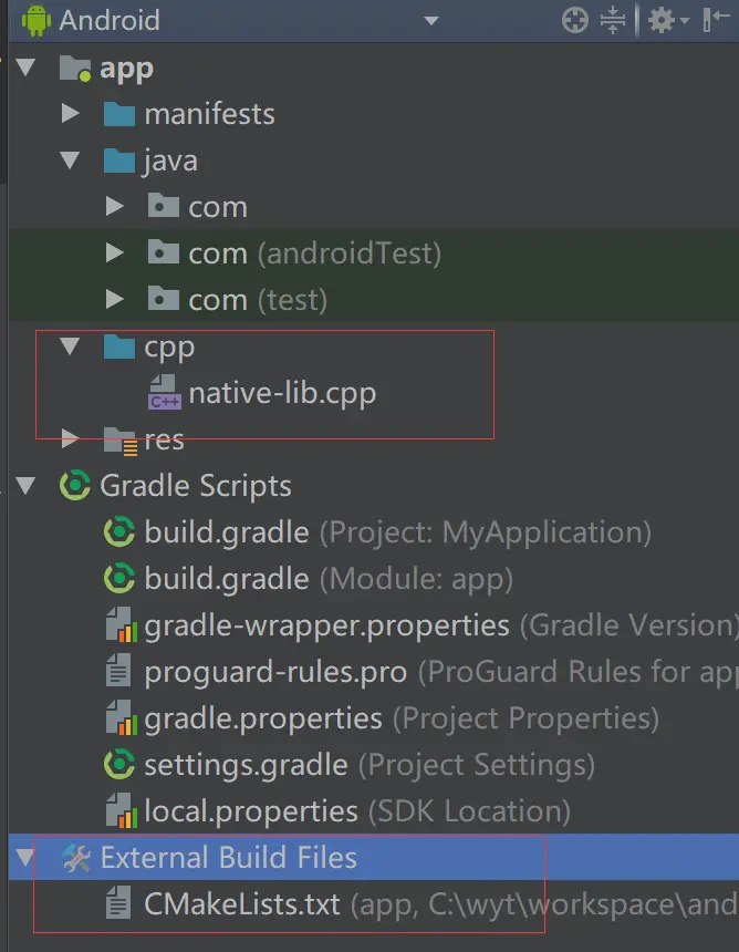 新建的 ndk 开发项目结构上与普通项目的区别主要有以下几点: