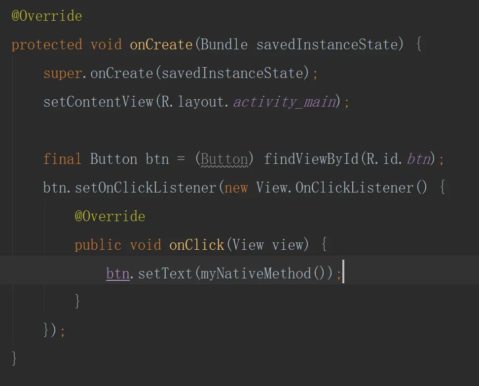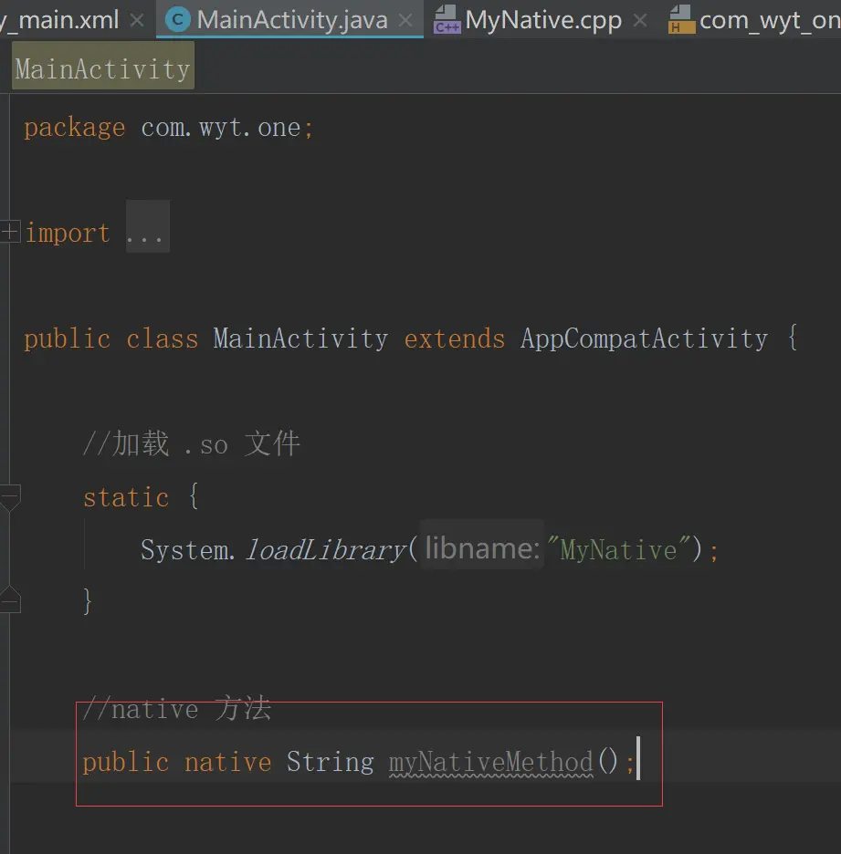 - 在 MainActivity 中添加 native 代码,myNativeMethod() 方法现在是红色的,因为现在还没有对应的native层方法实现,下面继续。