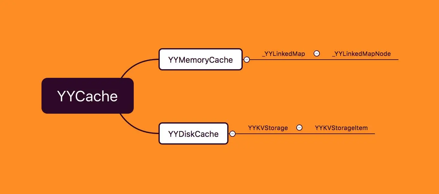 我们先来简单看一下 YYCache 的代码结构,YYCache 是由 YYMemoryCache 与 YYDiskCache 两部分组成的,其中 YYMemoryCache 作为高速内存缓存,而 YYDiskCache 则作为低速磁盘缓存。