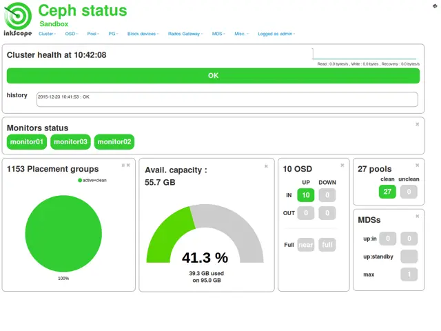 Inkscope 是一个 Ceph 的管理和监控系统,依赖于 Ceph 提供的 API,使用 MongoDB 来存储实时的监控数据和历史信息。