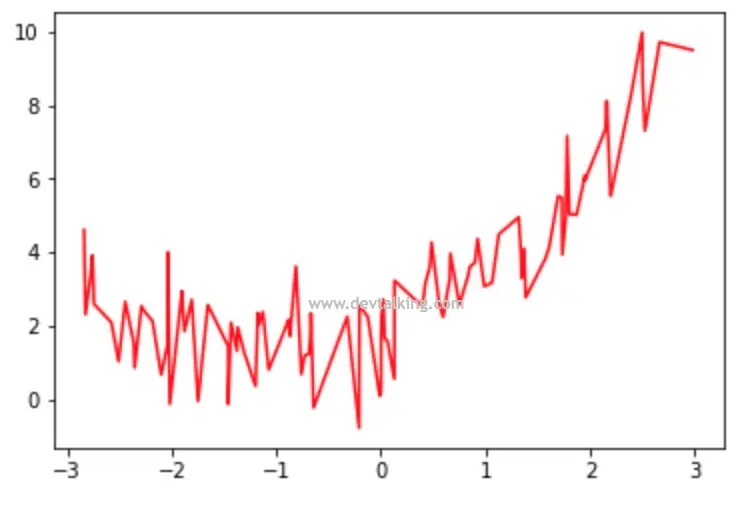 plt.plot(np.sort(x), y[np.argsort(x)], color='r')