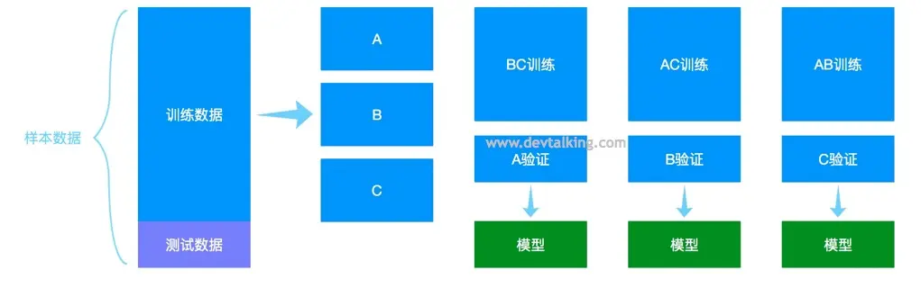 我们在验证数据集概念的基础上,再来看看交叉验证。交叉验证其实解决的是随机选取验证数据集的问题,因为如果验证数据集是固定的,那么万一验证数据集过拟合了,那就没有可用的验证数据集了,所以交叉验证提供了随机的、可持续的、客观的模型验证方式。
