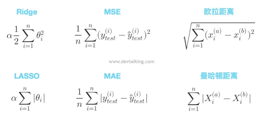 上图展示了模型正则化岭回归、LASSO回归,线性回归评测标准均方误差(MSE)、平均绝对误差(MAE),距离公式欧拉距离、曼哈顿距离之间的对比。我们可以发现一个很有意思的现象,第一行的三个公式都是平方求和的模式,第二行的三个公式都是绝对值求和的模式。其实虽然机器学习中的公式、名词很多,但是究其背后的数学原理都是有规律可循的。