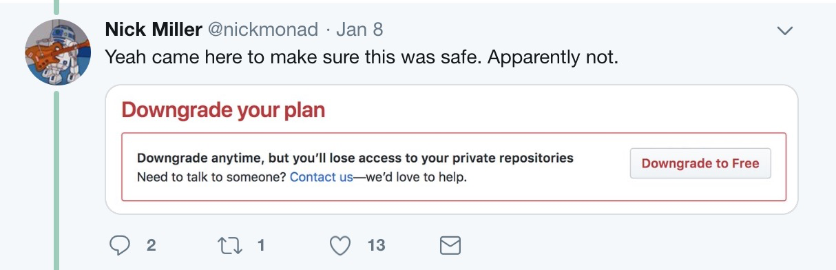 很多人在 Twitter 上吐槽,降级为免费版后无法访问私有仓库