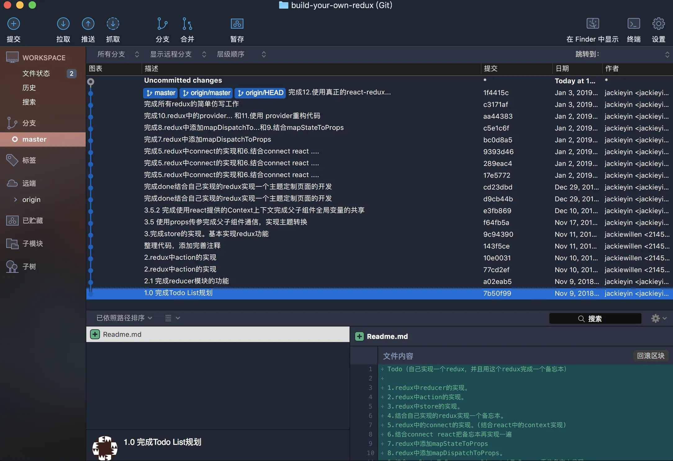 接下来我们试着一个一个去实现。当然这其中包括了为什么需要redux的历史演化的过程,总的用了十几个commit来完成了这篇文章,基本上每个commit实现TODO list中的一个计划(在这墙裂推荐你使用source tree这个工具来查看各个commit都干了啥,修改了啥,对阅读源代码很有帮助)。在完成一个完整的功能后都会使用完整的demo进行演示,基本上可以覆盖redux的进化历程了。最后真正实现redux的部分连100行代码都不到,所以你千万不要被redux的名头吓跑。最后再不要脸一下,如果你觉得文章写得还行,欢迎您在我的Github中送上star.