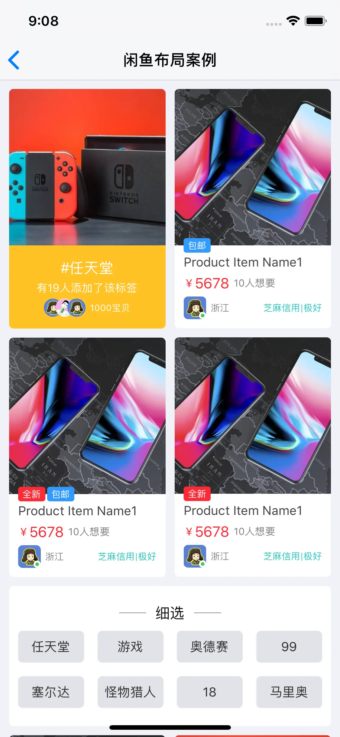 这篇带给大家的是对闲鱼app搜索结果页面的布局分析。这类布局的特点是瀑布流宫格布局,也可能设计多种不同的Cell(模板),先上图,如下: