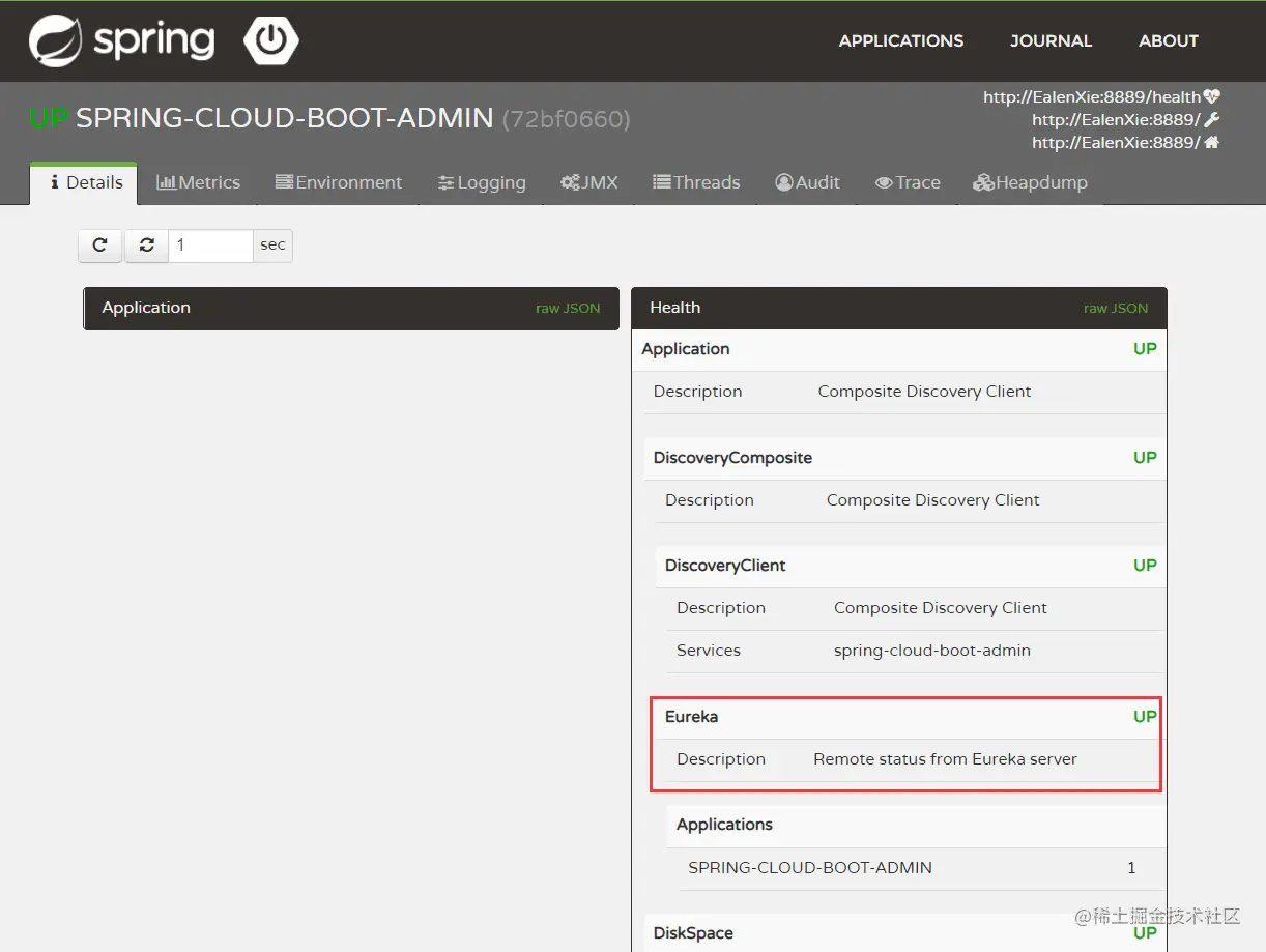 点开 Details按钮,可以看到Admin里面的各种详细配置信息,内存信息,接口调用次数,甚至是线程数量,都可以一目了然,十分方便。