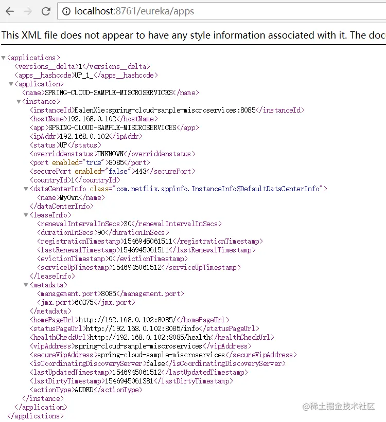 5. 启动Eureka Client,即可在Eureka Server上面看到注册上去的本服务,或者访问: http://localhost:8761/eureka/apps