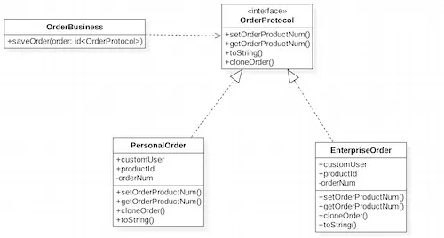 如图所示,通过if,else的判断操作,我们也能实现这种需求,但是这样有个很明显的缺点,就是OrderBusiness太依赖于具体的订单的具体实现了,一来不满足最少知识的原则,二来不利于后续的扩展新的订单类型。 为了解决这些问题,我们引入原型模式来看下