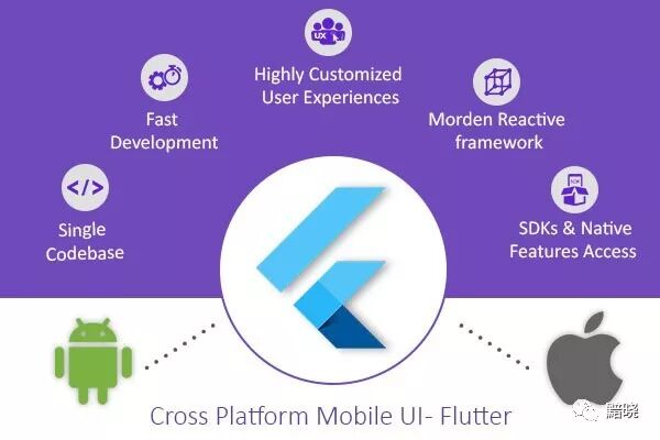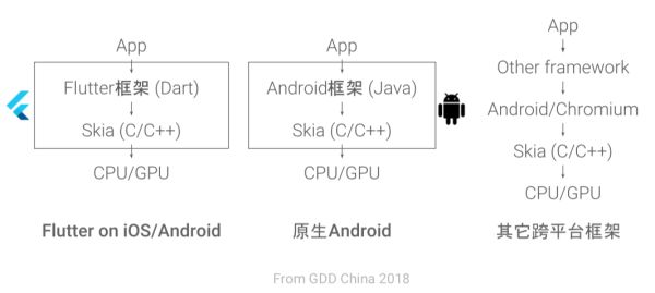 谁更快:React Native 这种从使用 JavaScript 到解析调用 Native 的过程中间显然要经过多个环节,而 Flutter 里将 Dart 代码 AOT 编译为本地代码,所以 Flutter 应用是直接使用本机指令集运行,这就不涉及解释器这一层。关于 Flutter 为什么这么快 Google 的工程师在 Google I/O、GDD 以及刚结束的 D2 上都有介绍,这里贴一张图可以简要说明「Flutter 相比 Android 与 其他跨平台框架相比为何那么快」的原因,见 [注1]。