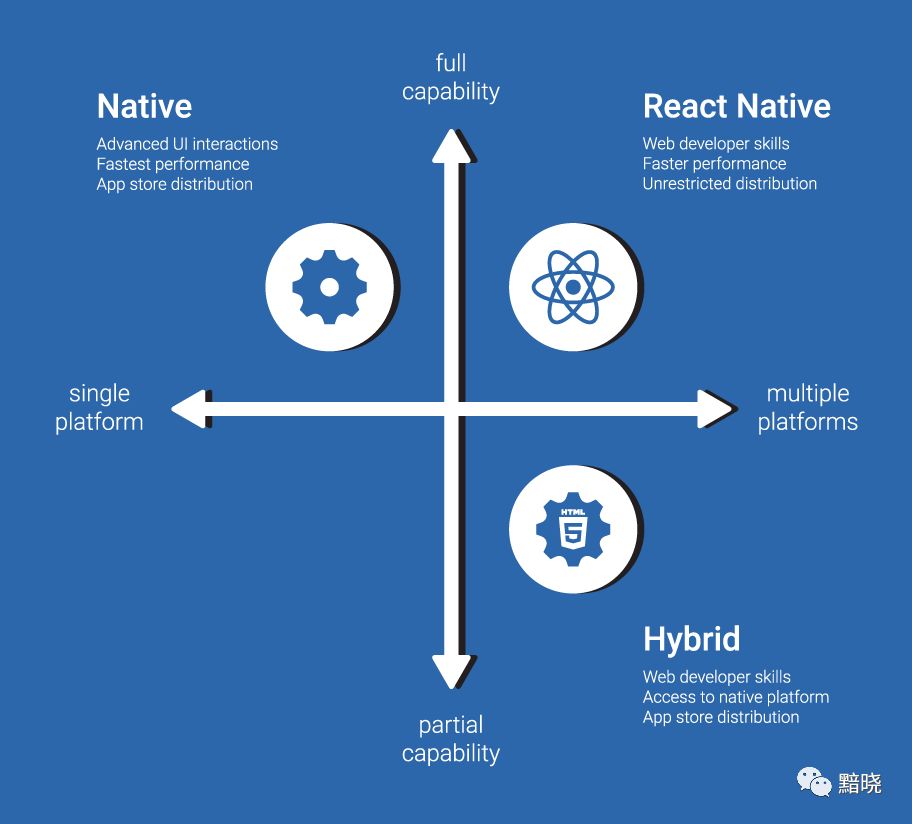 React Native 能够跨平台是因为它允许你使用 React / JavaScript / JSX 的写法写原生应用,而在底层他会替你调用相应的 iOS 原生组件或者 Android 原生组件,又或者直接生成适用于 Web 的 DOM 树。所以他做的事情是,用 JavaScript 调用对应系统渲染器进行渲染展示。