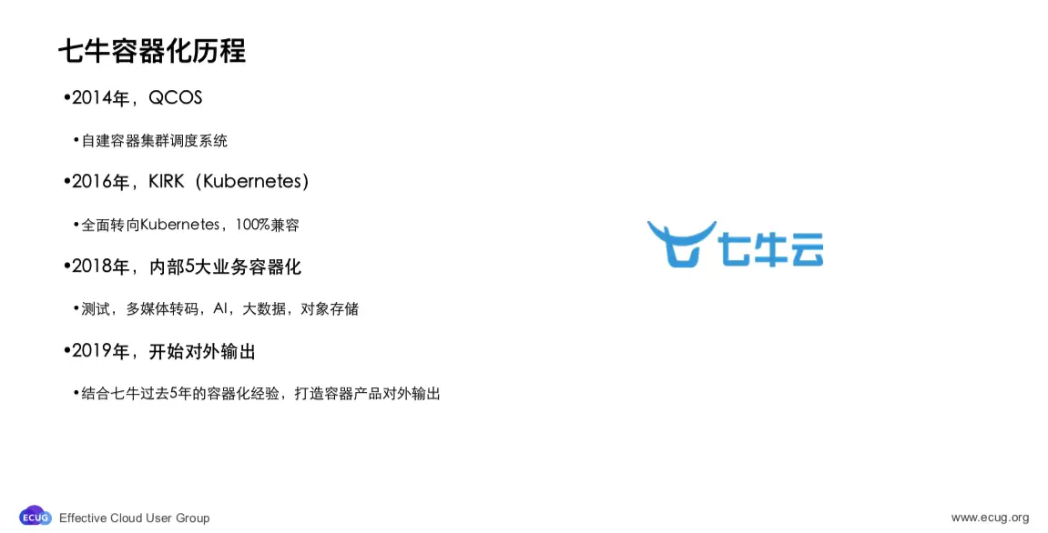 我们在本季度正热火朝天做一件事情,把七牛云最核心的对象存储业务搬到容器云上,这个事情已初步验证通过,正在切量过程中。到现在为止,七牛云的几大业务线都有大量应用运行在容器之上。从 2018 年下半年已经对一些外部客户输出容器产品,结合七牛云过去五年容器化经验,把我们好的技术、理念、功能打造成产品开始对外输出。