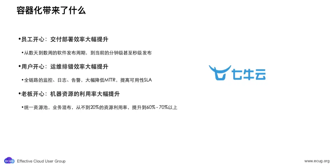 第一点,员工开心。交付部署效率大幅提升。原本从一行代码的提交到测试再到生产的上线,可能需要几天甚至几周时间,而且上线之后可能会不稳定要回滚,基于容器技术,可以把整套过程用 CICD 和 DevOPS 理念整合到一起,一行代码提交之后,可以让这行代码变更编译成一个镜像自动跑单元测试,跑完单元测试可以跑代码静态检查,也可以加一些自定义脚本,然后集成测试,最后是 CD 持续部署,线上连接起来。发布周期可以从几天、几周到分钟级甚至秒级。这个过程中,最简单的变化是员工很开心,开发、测试、运维,都可以早点下班,不用等到凌晨四点业务低峰时发布。