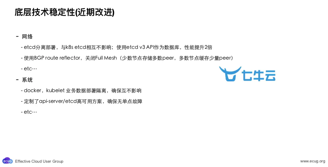 底层技术稳定性方面,我们每天都在迭代。这是我们近一两个月在做的事情,我们在网络模型上,etcd 分离部署,与 K8S etcd 互相不影响,使用 etcd V3 API 作为数据库,性能提升 2 倍;使用 BGP route refletor,关闭 Full Mesh,大幅提升性能。