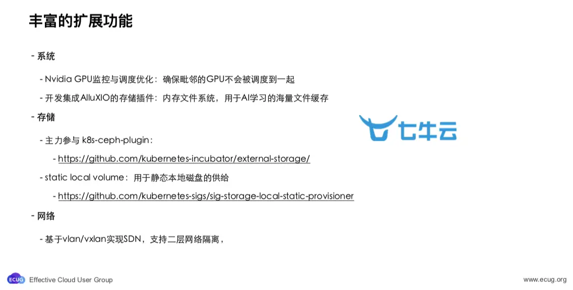 扩展方面,系统层面针对 Nvidia GPU 监控和调度做了优化,定制调度器确保 GPU 的调度性能,开发了 K8S 集成 AlluXIO 存储插件,通过这个插件可以让 AI 训练使用 AlluXIO 缓存海量文件。第二,我们在静态本地磁盘上启动了一个新的 Kubernetes SIG,基于这个很多人可以一起贡献代码,把静态本地磁盘供给做好。在网络上基于 vlan/vxlan 实现 SDN,支持二层网络隔离。
