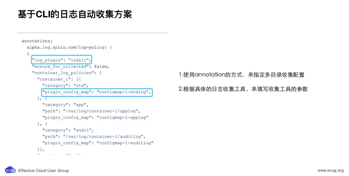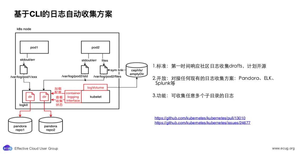 这是基于 CLI 的日志自动收集方案。主要原因是一个容器往往需要往多个目录打日志。但按照容器标准,只能往标准输出和标准错误里打日志,这样很难收集扩展多个目录的日志。CLI 是 Container Logging Interface 的缩写,它让整个方案能够对接任何现有的日志方案,比如可以对接七牛云的 Pandora,也可以支持 ELK、Splunk。