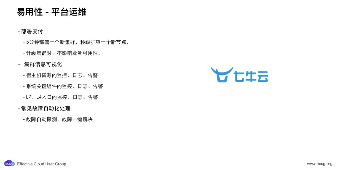 第一是部署、扩容、升级的便捷性。我们的目标是 5 分钟部署一个新集群,秒级扩容一个新节点。K8S 是开源生态,开源有很多安全性问题,我们如何在升级新版本时,让当前集群上的业务不会影响,这是一个非常关键的因素。