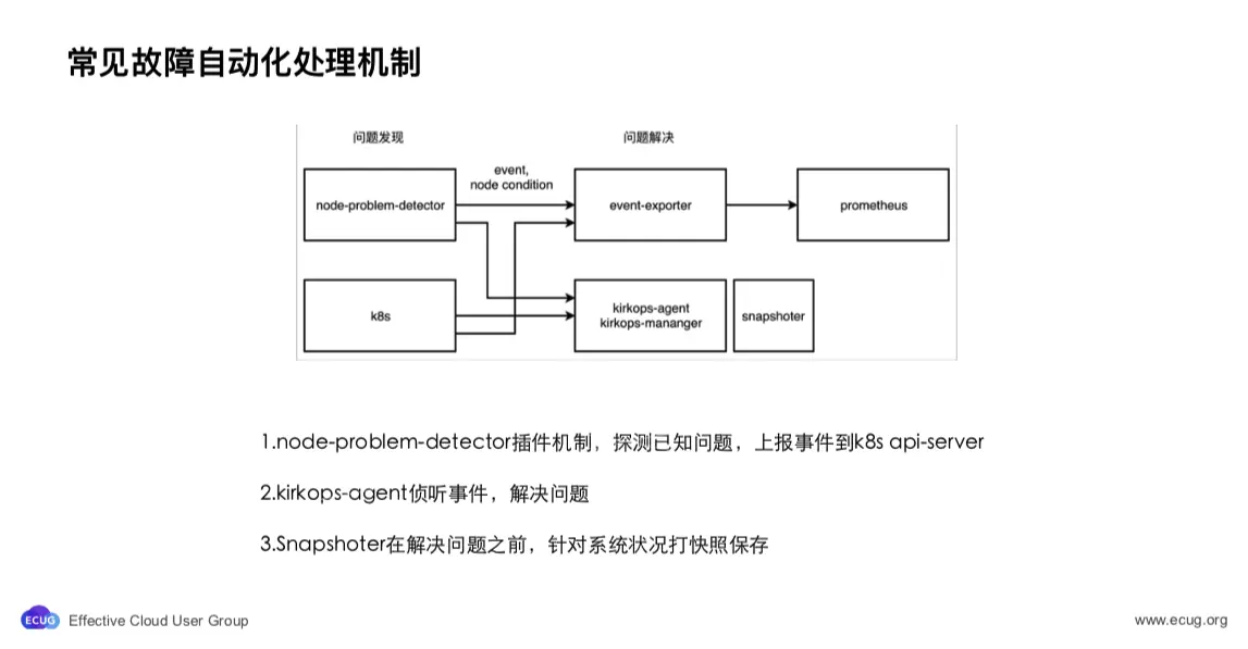 这是具有自动化运维处理机制的工具,每一台节点上都会运行这个工具,它能做到自动化探测,插件方式都是自动化探测已知现象,把这些上报到 K8S api-server,采取措施自动修复一些问题。