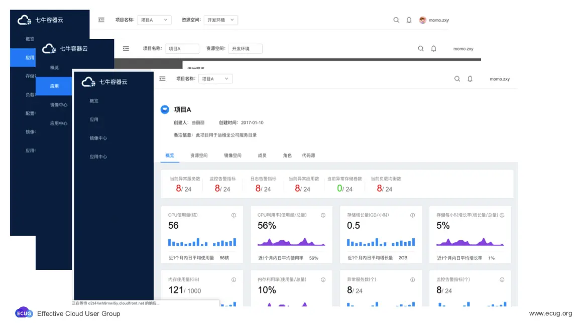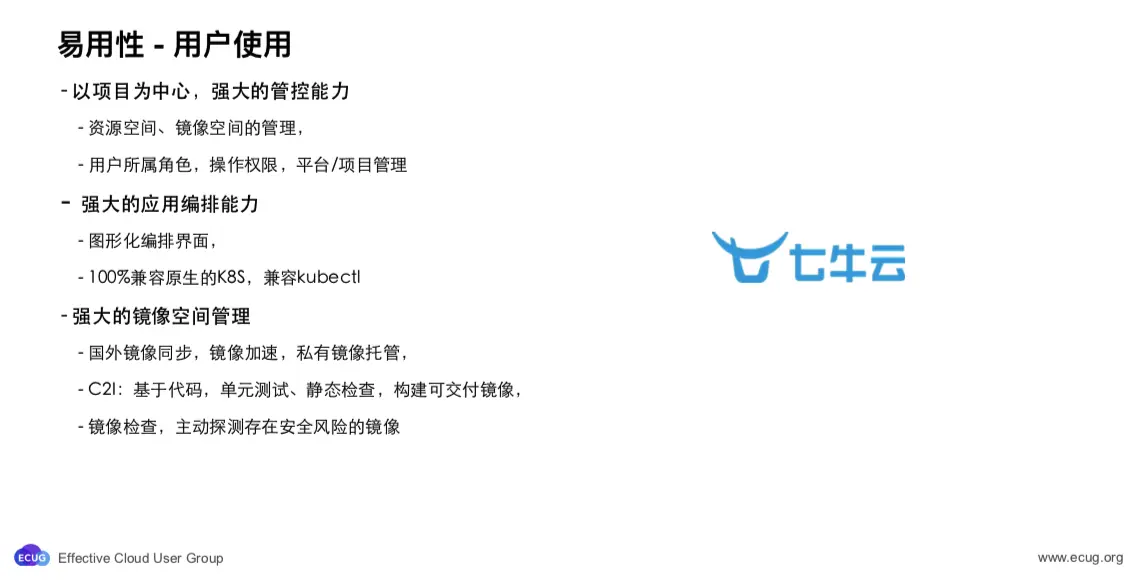 从用户使用层面讲易用性,我们是以项目为中心,对用户有强大的管控能力。传统项目都是先有虚拟项目再有人,然后是机器和软件。我们完全按照这样的方式管理项目,把 K8S 资源空间当做一堆资源,往项目里添加。项目里可能有项管、运维、测试、开发,每一个不同的人决策权限不一样。