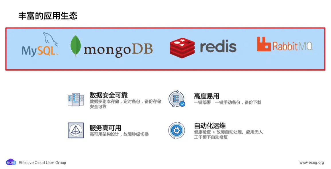 七牛云基于 K8S 实现了常见的数据库中间件服务,包含 MySQL、MongoDB、Redis、RabbitMQ。这些运维工具本质上就是由 Operator 实现的高可用服务,支持一键部署,能做定期备份和恢复,保证数据的可靠性。本质上是把公有云的 RDS 服务搬到 K8S 上,让非公有云用户使用高质量的数据库服务,大幅度减轻 DBA 的工作负担。