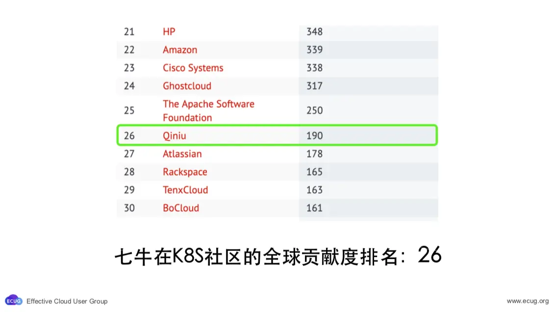 这是七牛云当前在 K8S 社区的全球排名,我们排第 26 名。可能会有人问,到底有多少人在开源,我的回答是我们没有一个人专职做开源,也没有把做开源当成很刻意的事情,是在维护 K8S 的稳定性、扩展功能、提高产品可用性的过程中,贡献一些东西。因为我们受益于开源,所以这些改进,新的功能我们都尽量直接贡献到开源。但我们不做三件事情:不去改拼写错误、增加单元测试、改注释。