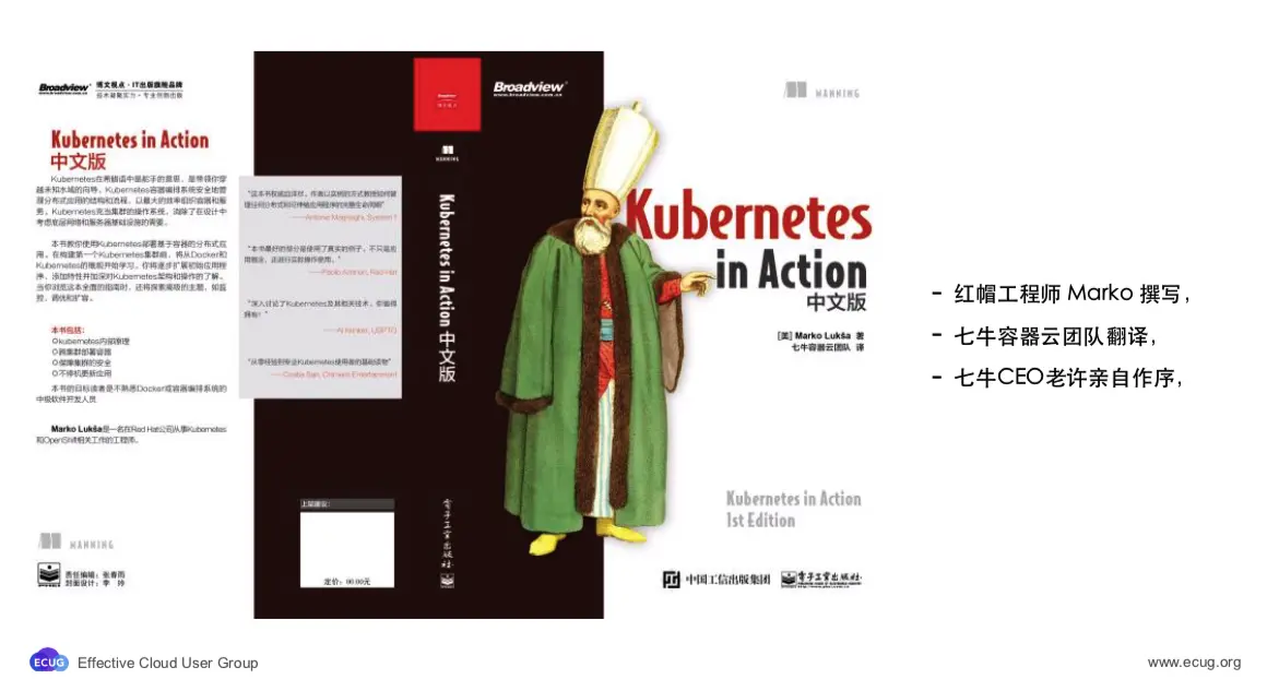 这是七牛容器云团队和七牛云内部一些小伙伴翻译的一本书,书的名字是《Kubernetes in Action》(中文版购买链接:item.m.jd.com/product/125… Kubernetes 上部署分布式容器应用,这本书的作者是 Marko Luksa,他是红帽 OpenShift 工程师,这本书由七牛云 CEO 老许亲自作序。翻译过程中,七牛容器云团队根据实际应用经验,把这本书翻译得尽量准确,并且通俗易懂。