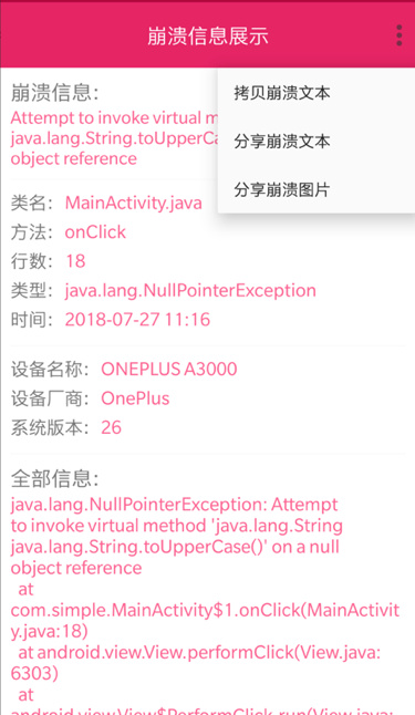在对Throwable解析完成后,我们就可以跳转到一个新的Activity并展示Crash的相关信息,这里Context是Application的Context,所有必须使用Intent.FLAG_ACTIVITY_NEW_TASK才能成功跳转。