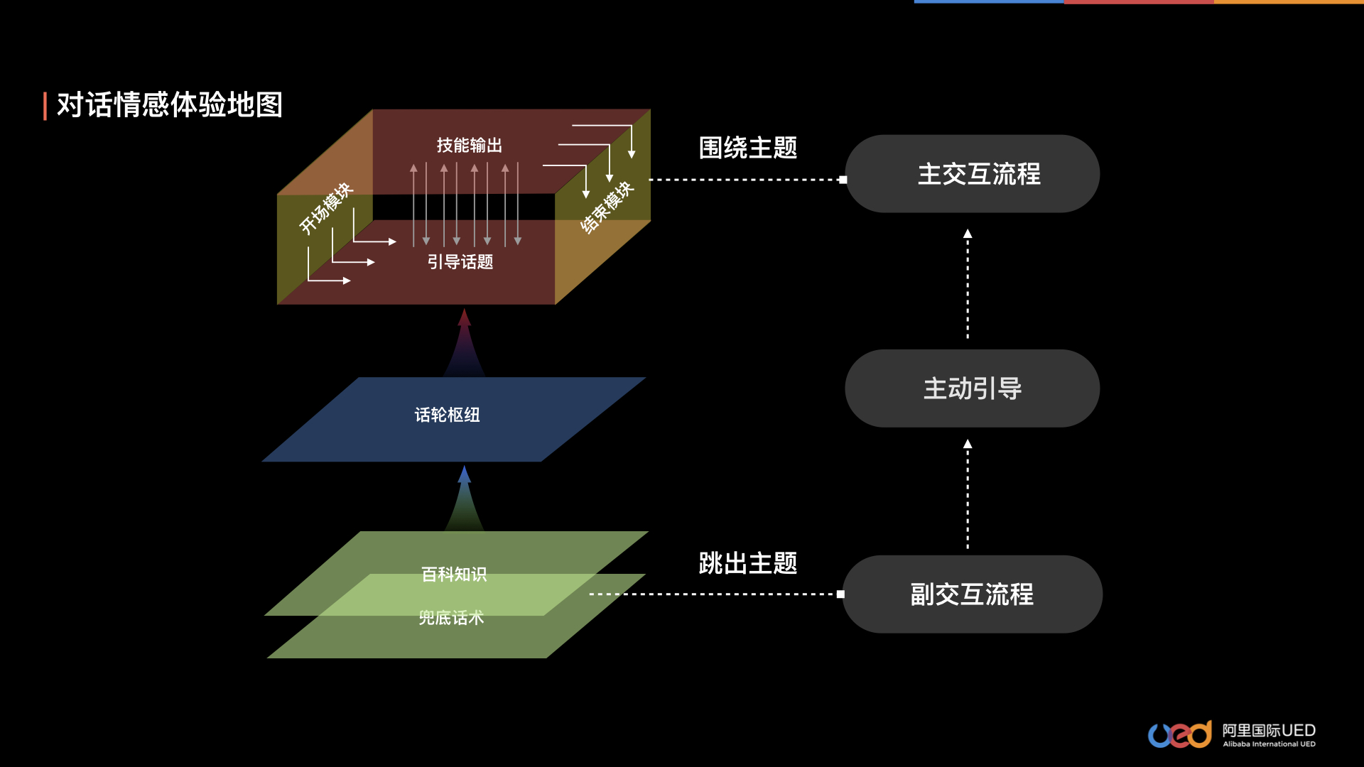 这种闲聊模式是半封闭的,「开场——引导——技能——结束」是一个完整的happy path,但是用户的思维具有发散性,很可能由现有语境跳转去其他话题,当用户的意图跳出话题时,使用百科知识和兜底话术应对,再通过话轮枢纽将重新引导回话题,尽量完成一个完整的对话流程。这种闲聊模式,我们称之为“对话情感体验地图”。