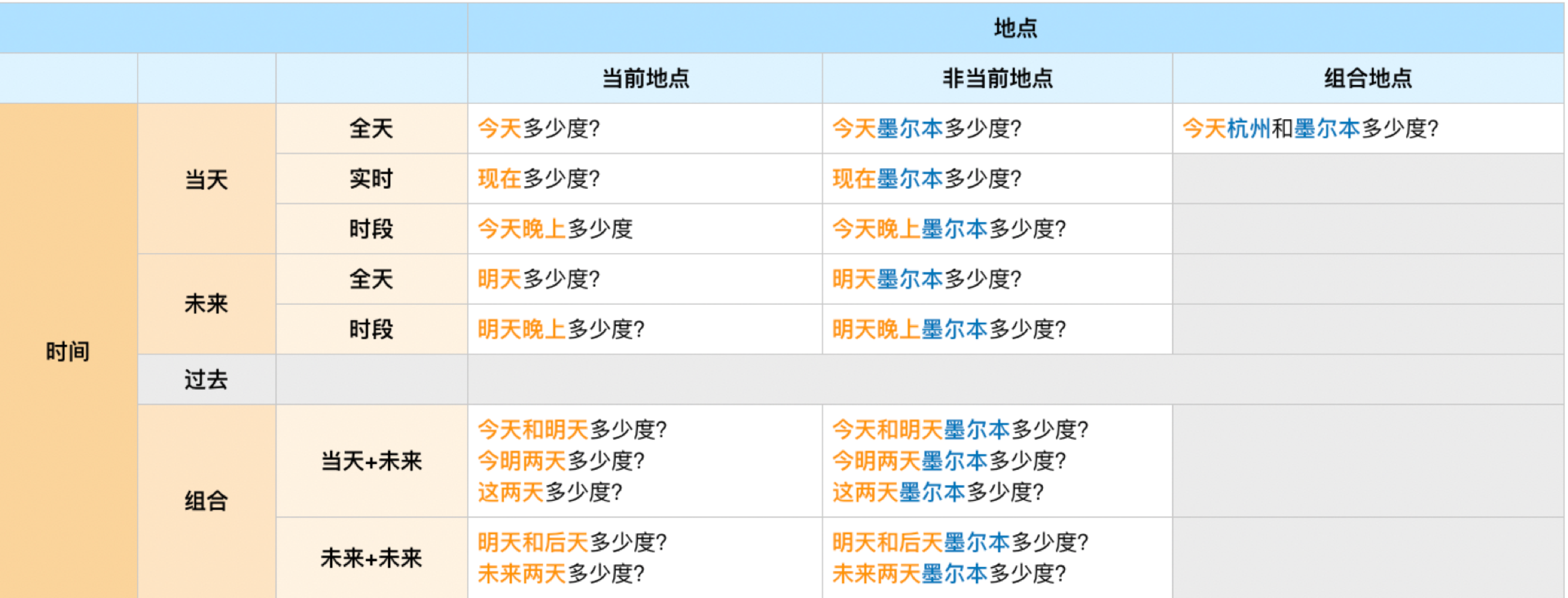 首先,语言是一个可以替换组合的装置。那么,我们从一个典型意图开始扩散,通过概念拆解,运用有规律的替换,可以发散出多种用户需求,并为之设计具有针对性的回复模式。如在“问天气”这个简单的场景中,最典型的用户意图是“今天杭州天气怎么样?”,但在现实中,用户的需求远不会这么简单。当我们对这个意图进行拆解,将其中的三个组成部分「今天」「杭州」「天气怎么样」进行有规律的替换和组合时,就会生成出复杂而众多的用户需求。