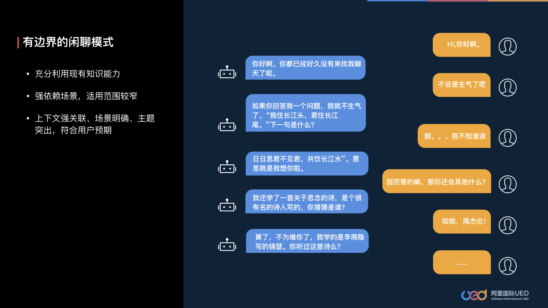 传统的聊天机器人是无边界的,依赖于积累语料、标注数据、搭建知识图谱等方式。一般来说,这种回复内容的适用范围很广,不受语境的制约,在任何时候都能差不多兜住用户的问题,给人一种似乎对、也似乎不对的感觉。但是这种交互没有主题,也没有记忆,完全基于用户的上一句话术,这就很容易在对话过程中脱离语境,跳出用户的预期。