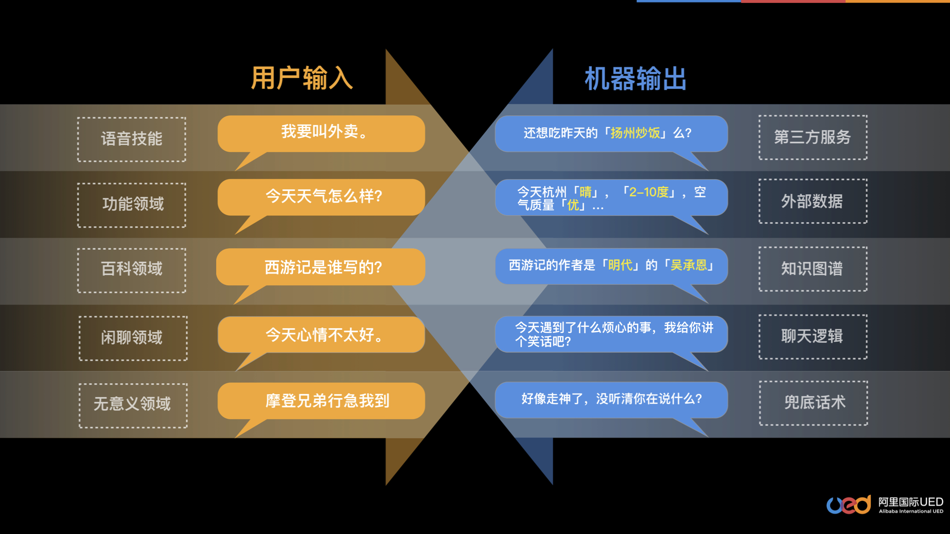 语音识别技术能够将人的语音转化为文本,计算机通过分词、parsing(句法分析)等方式理解文本中词与词的关系。但是,在真实世界中,用户语言和用户意图之间的关联却是很复杂。在语言学上,我们称之为“会话隐含意 (conversational implicature)”。这种语义高度依赖语境,具有不确定性,无法通过分析语法和词汇而得出。这样的用户需求无法完全依靠计算机的能力进行解析。以最简单的天气问询为例,“今天出门要带伞么?”对男性用户来说,关注点可能是天气的降雨情况;对女性用户来说,关注点可能是天气的日晒情况;如果当下的天气状况是乌云密布,用户意图大概率上又是询问降雨。这时,就需要设计师构建细致的判断逻辑,辅助计算机进行语义理解。