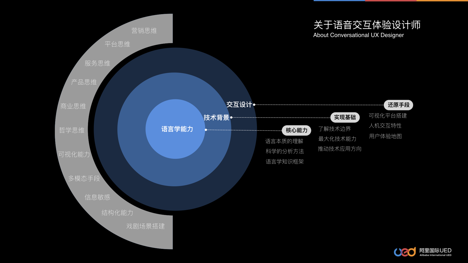 语音交互渗透人类生活场景的方方面面,这就对我们设计师提出了更高的综合素质的要求。阿里常说“既要、又要、还要”,对语音交互的体验设计师而言,既要具备语言学能力、技术背景、交互设计能力,又要有产品思维、营销思维、结构化能力、可视化能力,甚至是编剧能力,还要有一定高度的哲学思考。在人工智能的时代中,产品的形式不断突破人类的认知边界,如何理解人、如何理解人的认知、如何为计算机构建世界观,这都是值得我们思考的哲学命题。