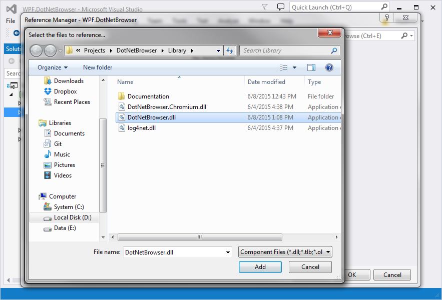 选择D:\ Projects \ DotNetBrowser \ Library \ DotNetBrowser.dll文件,然后单击添加: