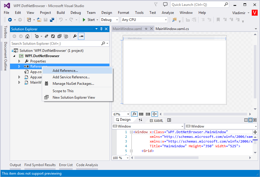在解决方案资源管理器中,右键单击WPF.DotNetBrowser并选择Add Existing Item: