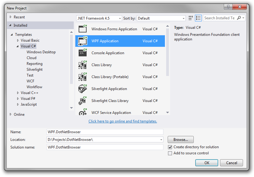 在D:\ Projects \ DotNetBrowser目录中创建一个新的WPF应用程序C#项目或WPF应用程序Visual Basic项目: