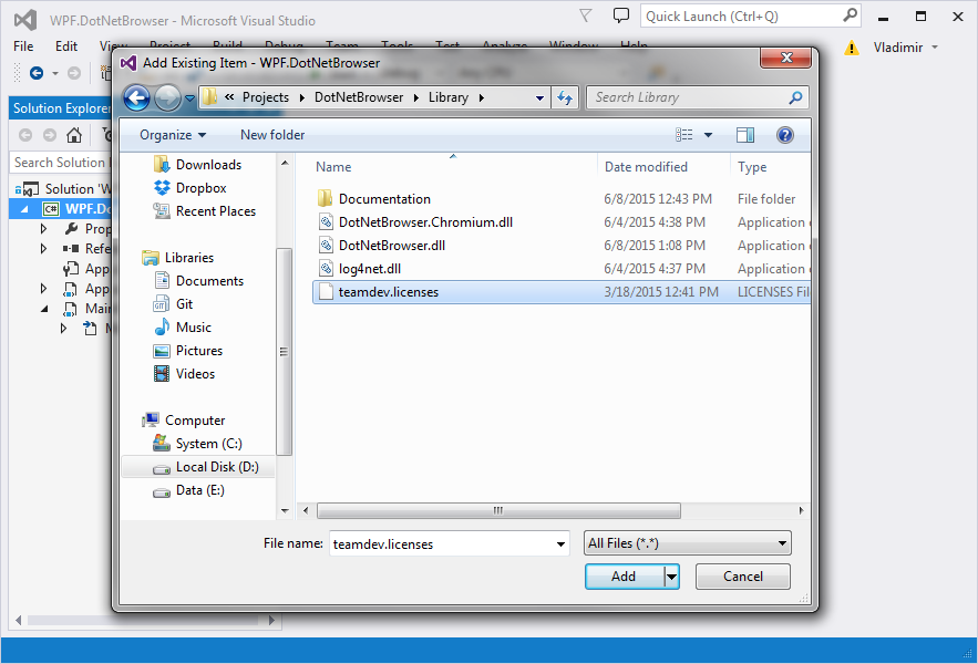 在文件打开对话框中,选择D:\ Projects \ DotNetBrowser \ Library \ teamdev.licenses文件,然后单击Add: