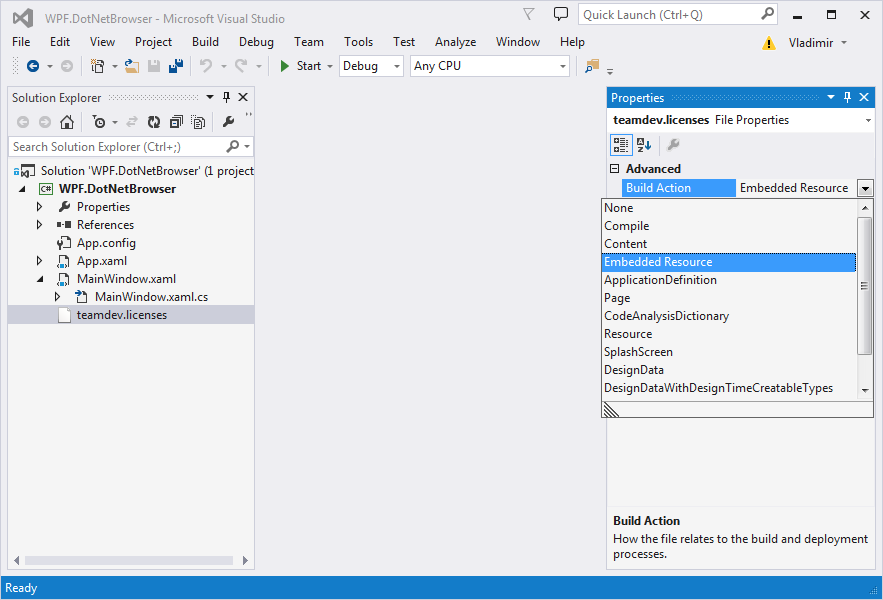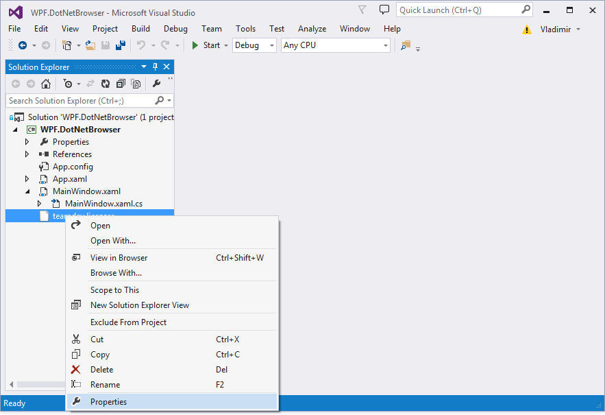 在Solution Explorer中,右键单击teamdev.licenses,然后选择Properties: