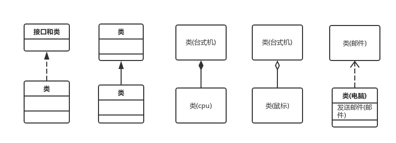 - 依赖:一个类用到另一个类,比如电脑类要执行发邮件方法,那么他可能依赖一个邮件类